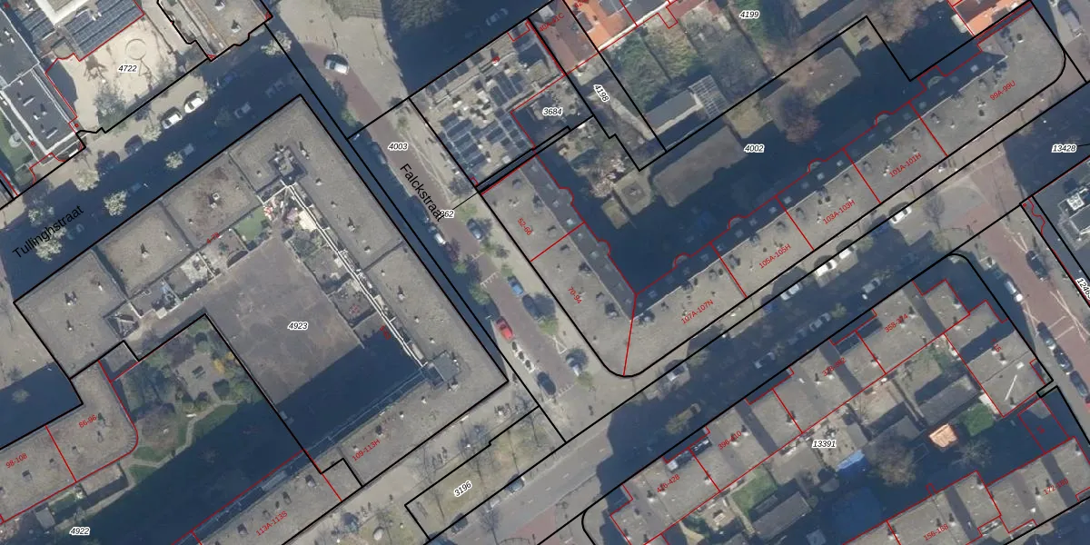Het perceel waarop Falckstraat 80 staat heeft een oppervlakte van 3041 m². Dit is een zeer groot perceel. De perceeloppervlakte wordt geregistreerd door het Kadaster. Gedetailleerde informatie over de maten van dit perceel kunt u vinden in het rapport Kadastrale kaart met maatvoering van Falckstraat 80.