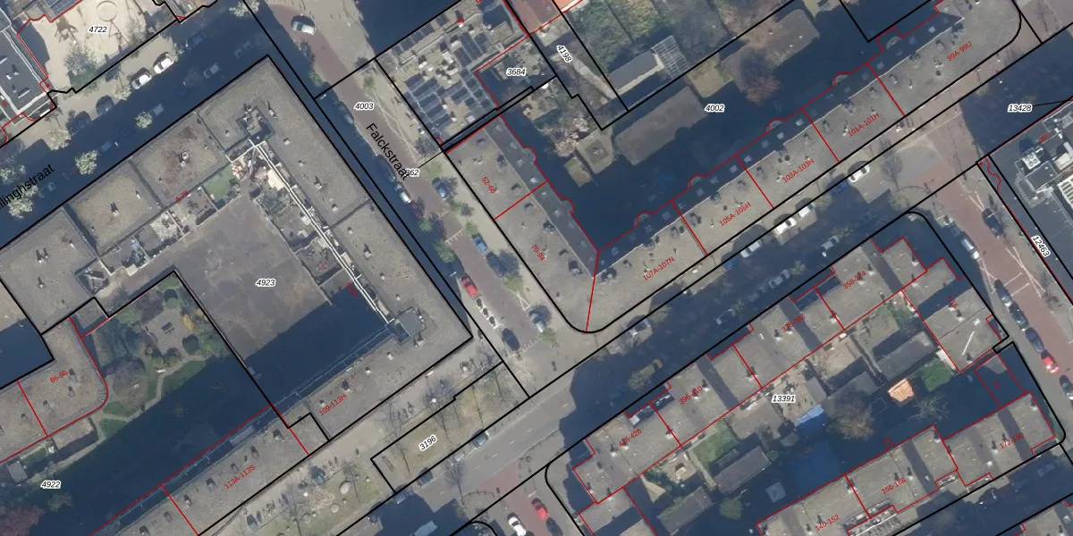 Het perceel waarop Falckstraat 90 staat heeft een oppervlakte van 3041 m². Dit is een zeer groot perceel. De perceeloppervlakte wordt geregistreerd door het Kadaster. Gedetailleerde informatie over de maten van dit perceel kunt u vinden in het rapport Kadastrale kaart met maatvoering van Falckstraat 90.