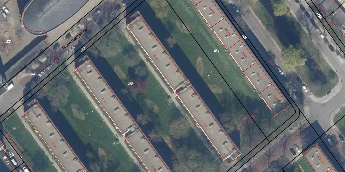 Het perceel waarop Fluitenbergstraat 66 staat heeft een oppervlakte van 1,3 ha. Dit is een zeer groot perceel. De perceeloppervlakte wordt geregistreerd door het Kadaster. Gedetailleerde informatie over de maten van dit perceel kunt u vinden in het rapport Kadastrale kaart met maatvoering van Fluitenbergstraat 66.