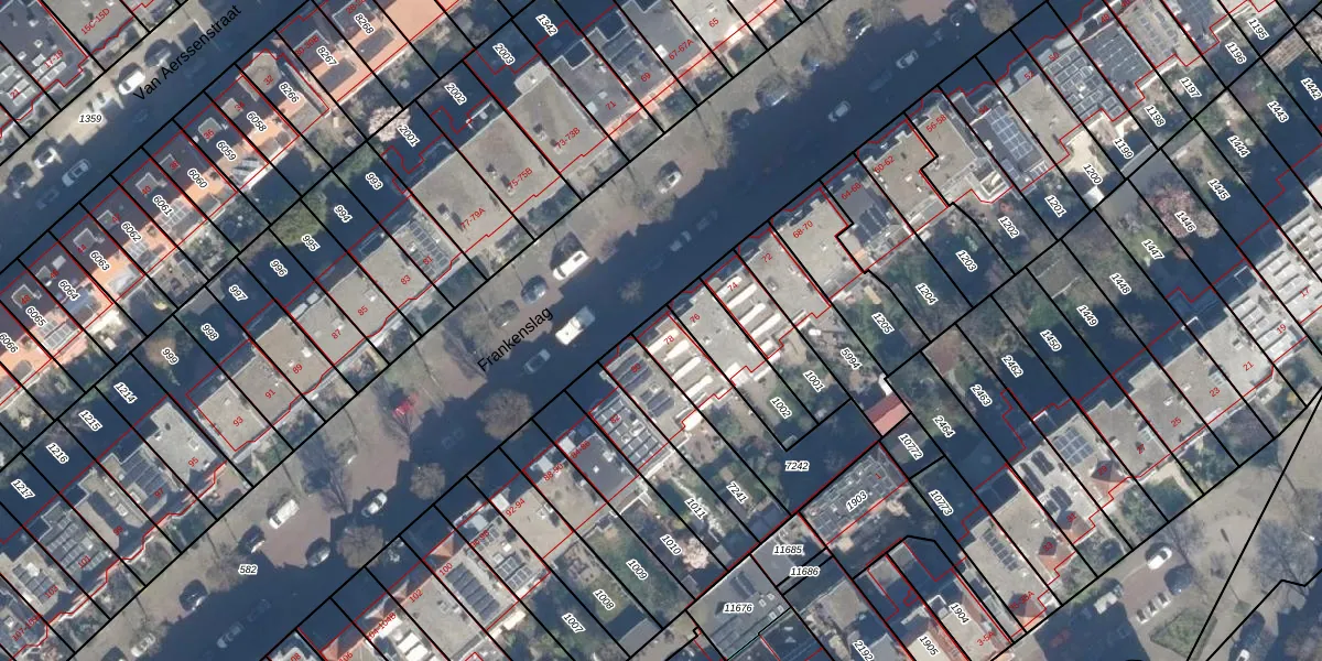 Het perceel waarop Frankenslag 78 staat heeft een oppervlakte van 335 m². Dit is een groot perceel. De perceeloppervlakte wordt geregistreerd door het Kadaster. Gedetailleerde informatie over de maten van dit perceel kunt u vinden in het rapport Kadastrale kaart met maatvoering van Frankenslag 78.