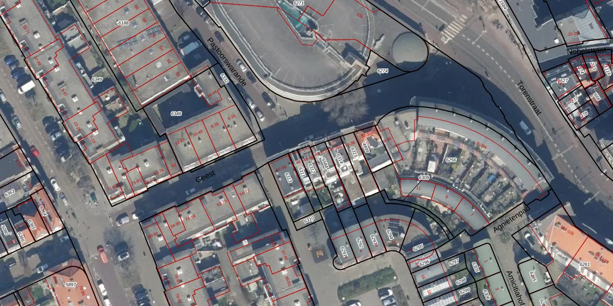Het perceel waarop Geest 44 staat heeft een oppervlakte van 87 m². Dit is een klein perceel. De perceeloppervlakte wordt geregistreerd door het Kadaster. Gedetailleerde informatie over de maten van dit perceel kunt u vinden in het rapport Kadastrale kaart met maatvoering van Geest 44.