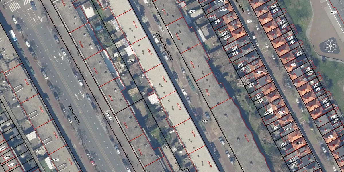 Het perceel waarop Gerard Doustraat 63-A staat heeft een oppervlakte van 2400 m². Dit is een zeer groot perceel. De perceeloppervlakte wordt geregistreerd door het Kadaster. Gedetailleerde informatie over de maten van dit perceel kunt u vinden in het rapport Kadastrale kaart met maatvoering van Gerard Doustraat 63-A.