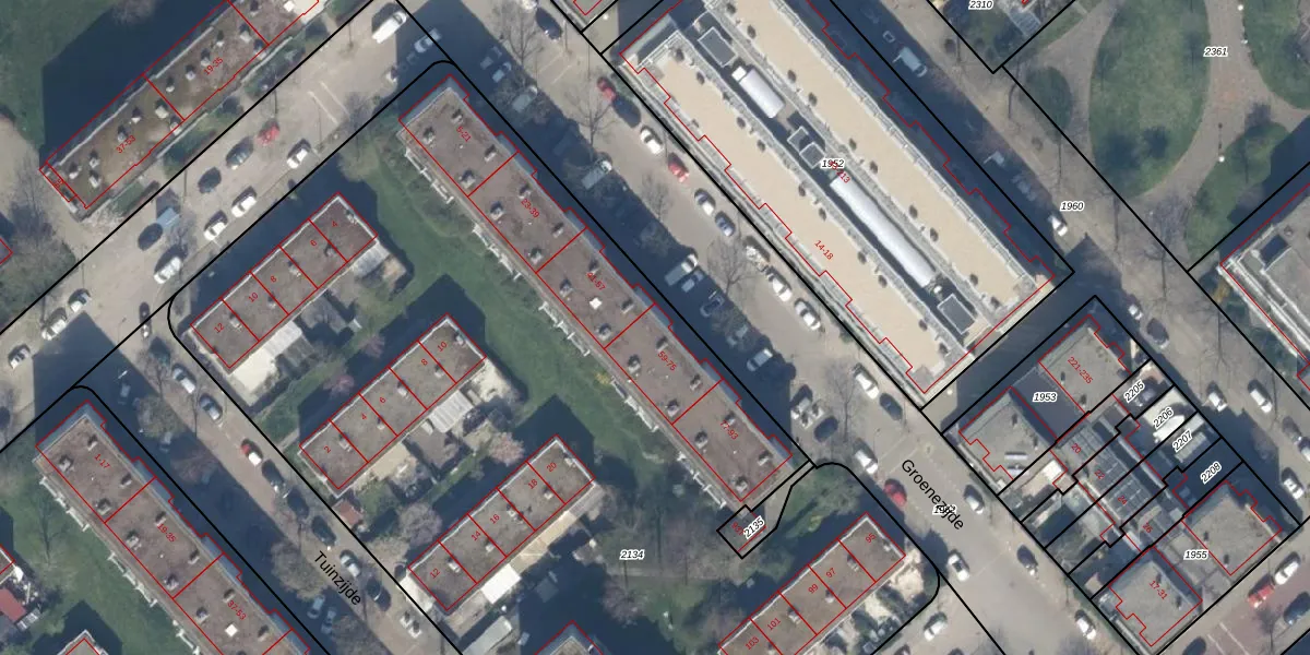 Het perceel waarop Groenezijde 63 staat heeft een oppervlakte van 6543 m². Dit is een zeer groot perceel. De perceeloppervlakte wordt geregistreerd door het Kadaster. Gedetailleerde informatie over de maten van dit perceel kunt u vinden in het rapport Kadastrale kaart met maatvoering van Groenezijde 63.