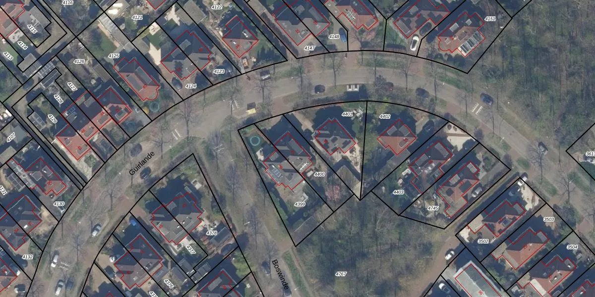 Het perceel waarop Guirlande 41 staat heeft een oppervlakte van 351 m². Dit is een groot perceel. De perceeloppervlakte wordt geregistreerd door het Kadaster. Gedetailleerde informatie over de maten van dit perceel kunt u vinden in het rapport Kadastrale kaart met maatvoering van Guirlande 41.
