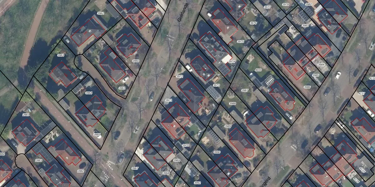 Het perceel waarop Guirlande 98 staat heeft een oppervlakte van 413 m². Dit is een groot perceel. De perceeloppervlakte wordt geregistreerd door het Kadaster. Gedetailleerde informatie over de maten van dit perceel kunt u vinden in het rapport Kadastrale kaart met maatvoering van Guirlande 98.