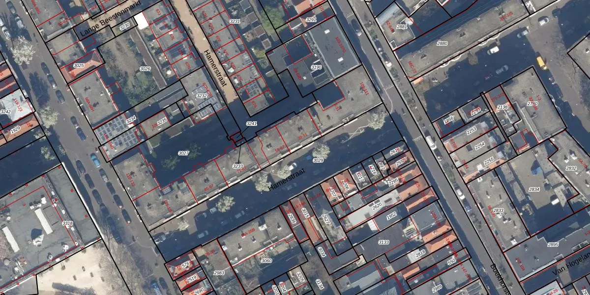 Het perceel waarop Hamerstraat 49 staat heeft een oppervlakte van 1731 m². Dit is een zeer groot perceel. De perceeloppervlakte wordt geregistreerd door het Kadaster. Gedetailleerde informatie over de maten van dit perceel kunt u vinden in het rapport Kadastrale kaart met maatvoering van Hamerstraat 49.