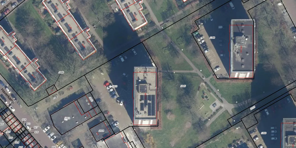 Het perceel waarop Haverkamp 14 staat heeft een oppervlakte van 2057 m². Dit is een zeer groot perceel. De perceeloppervlakte wordt geregistreerd door het Kadaster. Gedetailleerde informatie over de maten van dit perceel kunt u vinden in het rapport Kadastrale kaart met maatvoering van Haverkamp 14.