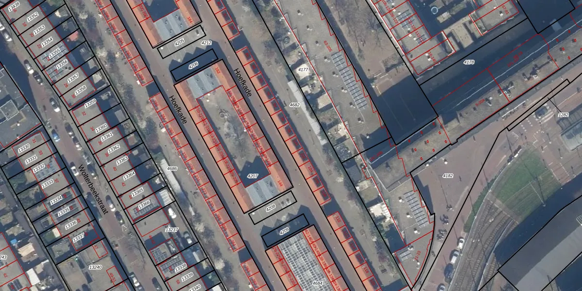 Het perceel waarop Hoefkade 100 staat heeft een oppervlakte van 2402 m². Dit is een zeer groot perceel. De perceeloppervlakte wordt geregistreerd door het Kadaster. Gedetailleerde informatie over de maten van dit perceel kunt u vinden in het rapport Kadastrale kaart met maatvoering van Hoefkade 100.