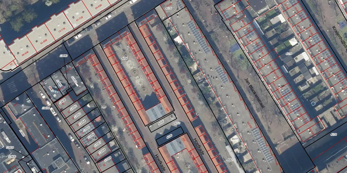 Het perceel waarop Hoefkade 76 staat heeft een oppervlakte van 2402 m². Dit is een zeer groot perceel. De perceeloppervlakte wordt geregistreerd door het Kadaster. Gedetailleerde informatie over de maten van dit perceel kunt u vinden in het rapport Kadastrale kaart met maatvoering van Hoefkade 76.