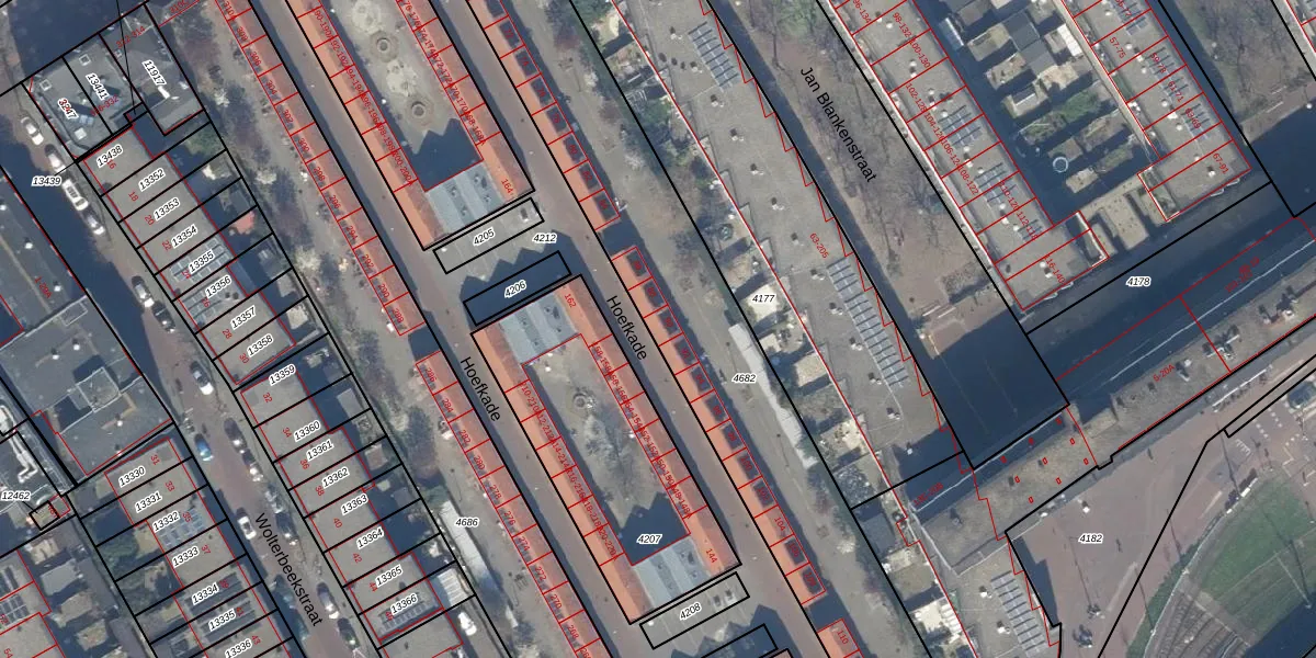 Het perceel waarop Hoefkade 90 staat heeft een oppervlakte van 2402 m². Dit is een zeer groot perceel. De perceeloppervlakte wordt geregistreerd door het Kadaster. Gedetailleerde informatie over de maten van dit perceel kunt u vinden in het rapport Kadastrale kaart met maatvoering van Hoefkade 90.