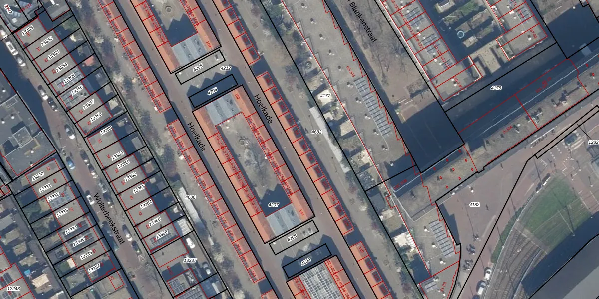 Het perceel waarop Hoefkade 96 staat heeft een oppervlakte van 2402 m². Dit is een zeer groot perceel. De perceeloppervlakte wordt geregistreerd door het Kadaster. Gedetailleerde informatie over de maten van dit perceel kunt u vinden in het rapport Kadastrale kaart met maatvoering van Hoefkade 96.