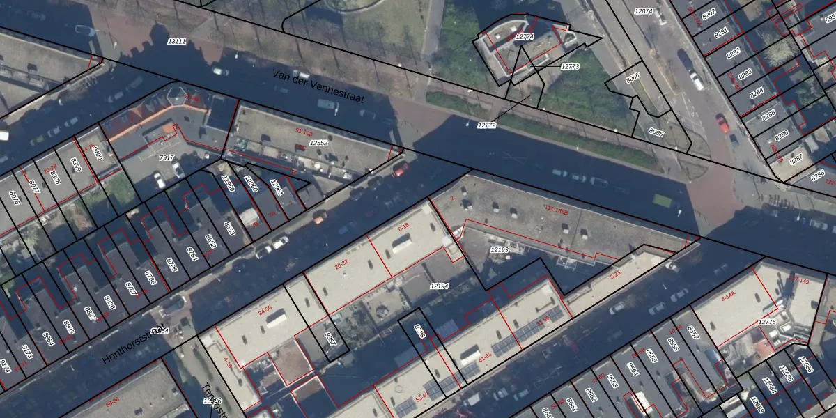 Honthorststraat 12 is gelegen op kadastraal perceel GVH08L12194. Deze kadastrale aanduiding is uniek en wordt gebruikt door het Kadaster om eigendomsrechten en andere zakelijke rechten vast te leggen. Het perceel maakt onderdeel uit van de kadastrale gemeente 's-Gravenhage.