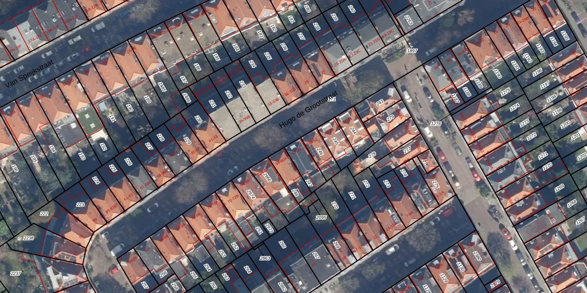 Hugo de Grootstraat 54 is gelegen op kadastraal perceel GVH18Z247. Deze kadastrale aanduiding is uniek en wordt gebruikt door het Kadaster om eigendomsrechten en andere zakelijke rechten vast te leggen. Het perceel maakt onderdeel uit van de kadastrale gemeente 's-Gravenhage.