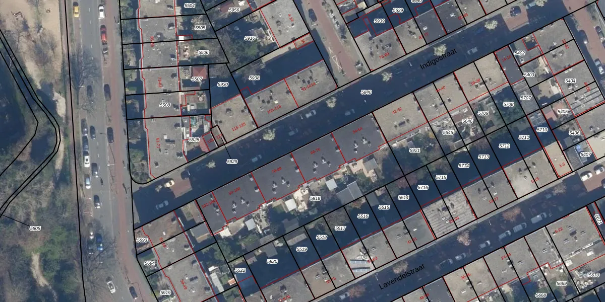 Het perceel waarop Indigostraat 76 staat heeft een oppervlakte van 1536 m². Dit is een zeer groot perceel. De perceeloppervlakte wordt geregistreerd door het Kadaster. Gedetailleerde informatie over de maten van dit perceel kunt u vinden in het rapport Kadastrale kaart met maatvoering van Indigostraat 76.