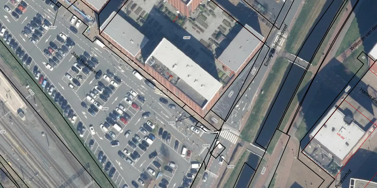 Het perceel waarop het adres ligt is GVH43-BD-5985. De afkorting 'GVH43' staat voor kadastrale gemeente 's-Gravenhage. De oppervlakte van het perceel is 3640 m². Dat is groter dan gemiddeld in 's-Gravenhage, waar de gemiddelde perceeloppervlakte op 872,68 m² ligt. De grootste perceeloppervlakte in de kadastrale gemeente is 17,7 ha. De kleinste oppervlakte bedraagt 0 m². Er zijn 87 adressen aanwezig op het perceel. In de Basisregistratie Kadaster (BRK) werden de grenzen van het perceel geregistreerd op 11-12-2014.