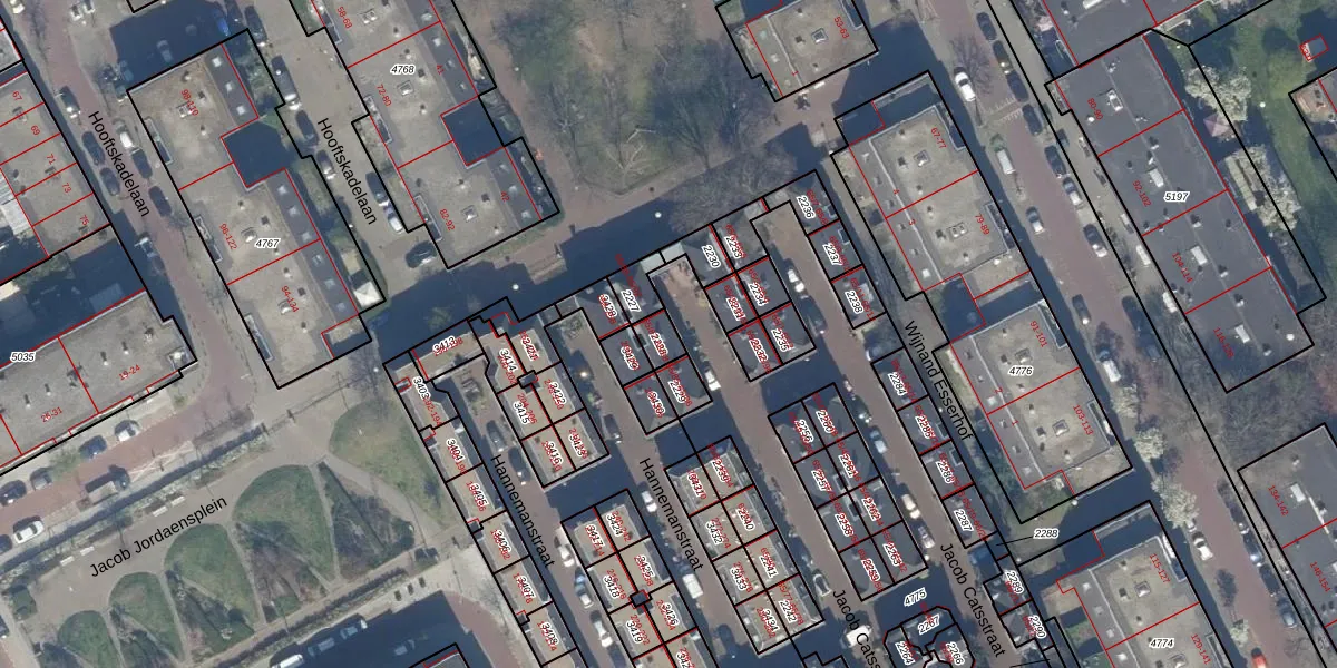 Het perceel waarop Jacob Catsstraat 65-87 staat heeft een oppervlakte van 42 m². Dit is een klein perceel. De perceeloppervlakte wordt geregistreerd door het Kadaster. Gedetailleerde informatie over de maten van dit perceel kunt u vinden in het rapport Kadastrale kaart met maatvoering van Jacob Catsstraat 65-87.