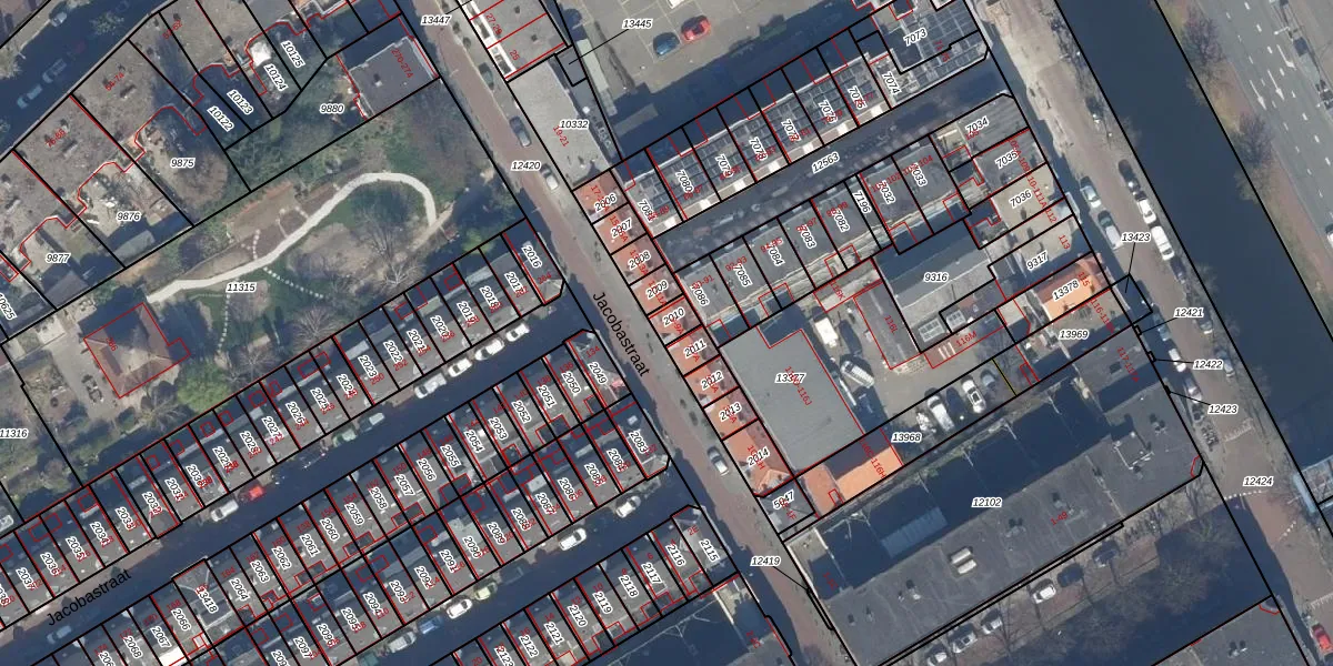 Het perceel waarop Jacobastraat 9 staat heeft een oppervlakte van 37 m². Dit is een klein perceel. De perceeloppervlakte wordt geregistreerd door het Kadaster. Gedetailleerde informatie over de maten van dit perceel kunt u vinden in het rapport Kadastrale kaart met maatvoering van Jacobastraat 9.