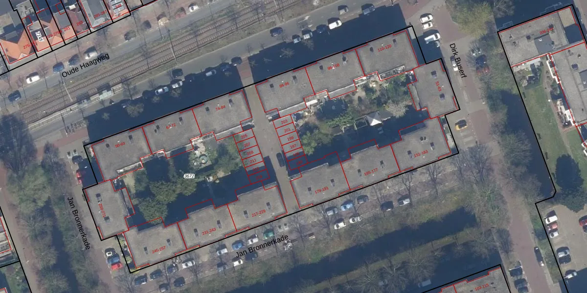 Jan Bronnerkade 197 is gelegen op kadastraal perceel LDN03M3672. Deze kadastrale aanduiding is uniek en wordt gebruikt door het Kadaster om eigendomsrechten en andere zakelijke rechten vast te leggen. Het perceel maakt onderdeel uit van de kadastrale gemeente Loosduinen.
