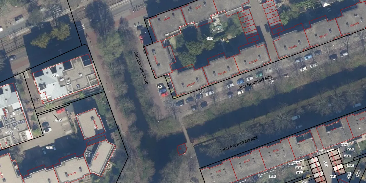 Het perceel waarop Jan Bronnerkade 249 staat heeft een oppervlakte van 5709 m². Dit is een zeer groot perceel. De perceeloppervlakte wordt geregistreerd door het Kadaster. Gedetailleerde informatie over de maten van dit perceel kunt u vinden in het rapport Kadastrale kaart met maatvoering van Jan Bronnerkade 249.