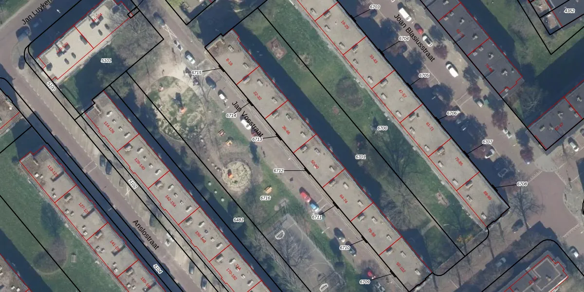 Het perceel waarop Jan Vosstraat 42 staat heeft een oppervlakte van 2470 m². Dit is een zeer groot perceel. De perceeloppervlakte wordt geregistreerd door het Kadaster. Gedetailleerde informatie over de maten van dit perceel kunt u vinden in het rapport Kadastrale kaart met maatvoering van Jan Vosstraat 42.