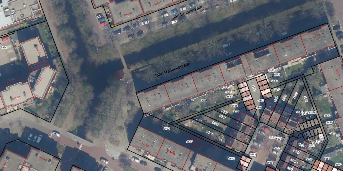 Het perceel waarop John Rädeckerkade 21 staat heeft een oppervlakte van 2573 m². Dit is een zeer groot perceel. De perceeloppervlakte wordt geregistreerd door het Kadaster. Gedetailleerde informatie over de maten van dit perceel kunt u vinden in het rapport Kadastrale kaart met maatvoering van John Rädeckerkade 21.