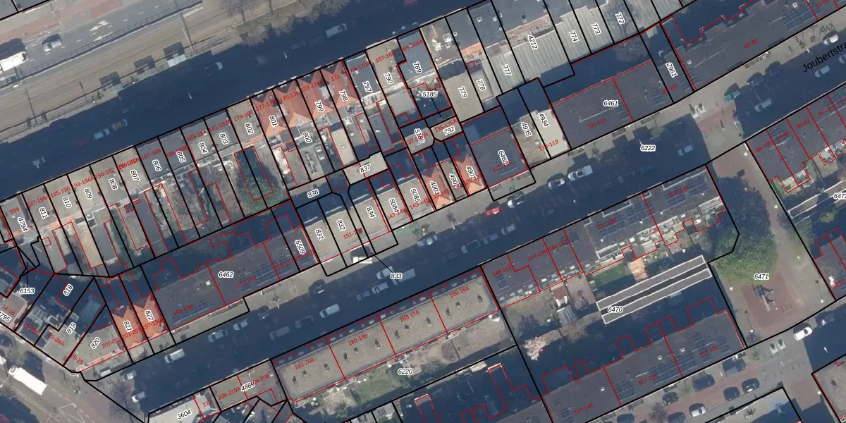 Het perceel waarop Joubertstraat 143 staat heeft een oppervlakte van 99 m². Dit is een klein perceel. De perceeloppervlakte wordt geregistreerd door het Kadaster. Gedetailleerde informatie over de maten van dit perceel kunt u vinden in het rapport Kadastrale kaart met maatvoering van Joubertstraat 143.