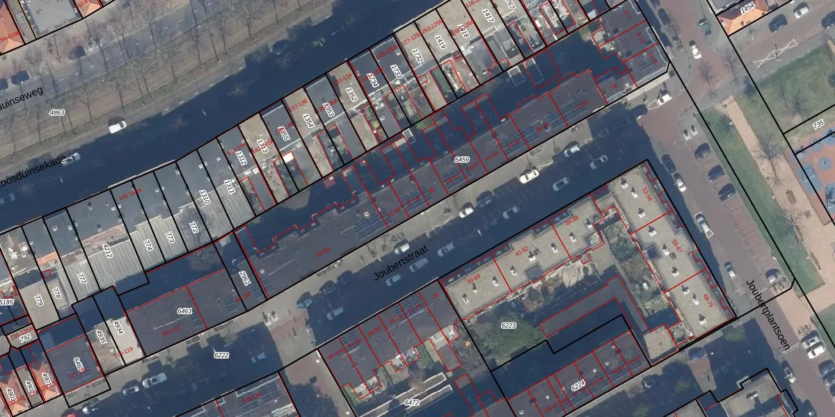 Het perceel waarop Joubertstraat 59 staat heeft een oppervlakte van 2125 m². Dit is een zeer groot perceel. De perceeloppervlakte wordt geregistreerd door het Kadaster. Gedetailleerde informatie over de maten van dit perceel kunt u vinden in het rapport Kadastrale kaart met maatvoering van Joubertstraat 59.
