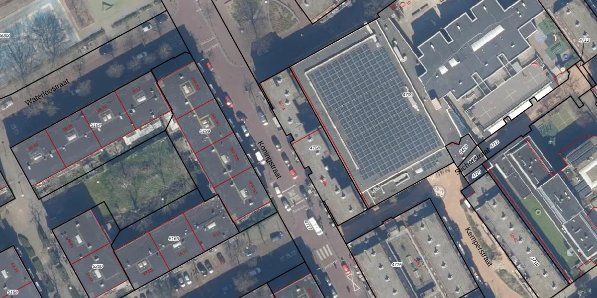 Het perceel waarop Koningstraat 84 staat heeft een oppervlakte van 640 m². Dit is een groot perceel. De perceeloppervlakte wordt geregistreerd door het Kadaster. Gedetailleerde informatie over de maten van dit perceel kunt u vinden in het rapport Kadastrale kaart met maatvoering van Koningstraat 84.