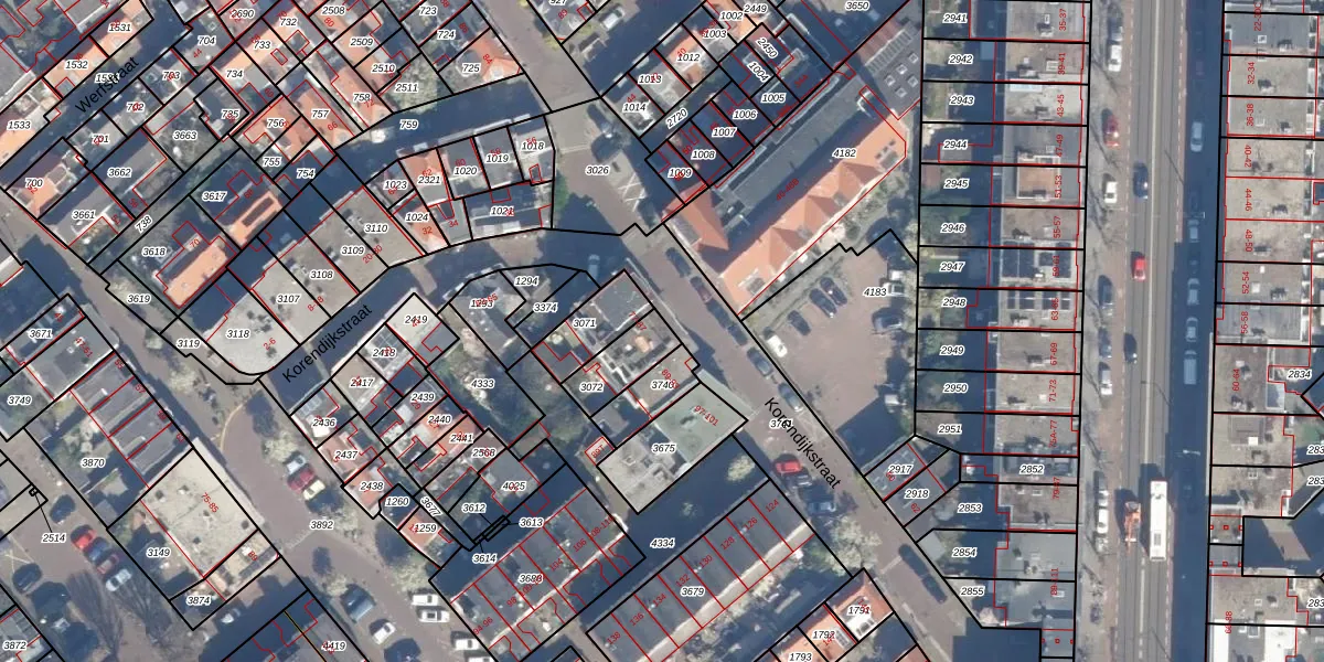 Korendijkstraat 87 is gelegen op kadastraal perceel GVH23AF3072. Deze kadastrale aanduiding is uniek en wordt gebruikt door het Kadaster om eigendomsrechten en andere zakelijke rechten vast te leggen. Het perceel maakt onderdeel uit van de kadastrale gemeente 's-Gravenhage.