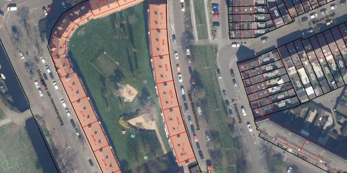 Lippe-Biesterfeldweg 108 is gelegen op kadastraal perceel LDN03M1944. Deze kadastrale aanduiding is uniek en wordt gebruikt door het Kadaster om eigendomsrechten en andere zakelijke rechten vast te leggen. Het perceel maakt onderdeel uit van de kadastrale gemeente Loosduinen.