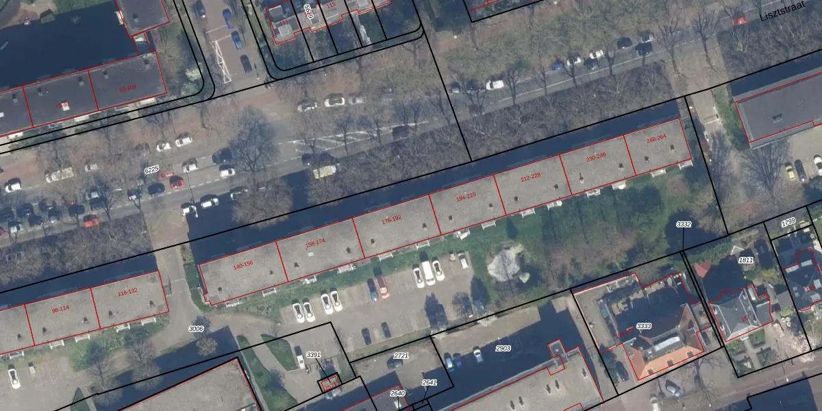 Het perceel waarop Lisztstraat 186 staat heeft een oppervlakte van 7324 m². Dit is een zeer groot perceel. De perceeloppervlakte wordt geregistreerd door het Kadaster. Gedetailleerde informatie over de maten van dit perceel kunt u vinden in het rapport Kadastrale kaart met maatvoering van Lisztstraat 186.