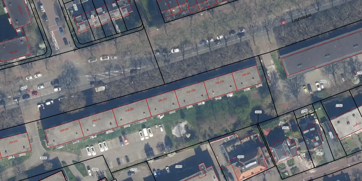 Het perceel waarop Lisztstraat 218 staat heeft een oppervlakte van 7324 m². Dit is een zeer groot perceel. De perceeloppervlakte wordt geregistreerd door het Kadaster. Gedetailleerde informatie over de maten van dit perceel kunt u vinden in het rapport Kadastrale kaart met maatvoering van Lisztstraat 218.