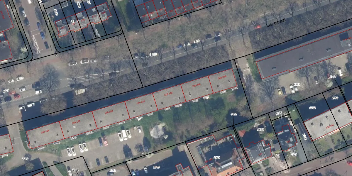 Het perceel waarop Lisztstraat 222 staat heeft een oppervlakte van 7324 m². Dit is een zeer groot perceel. De perceeloppervlakte wordt geregistreerd door het Kadaster. Gedetailleerde informatie over de maten van dit perceel kunt u vinden in het rapport Kadastrale kaart met maatvoering van Lisztstraat 222.