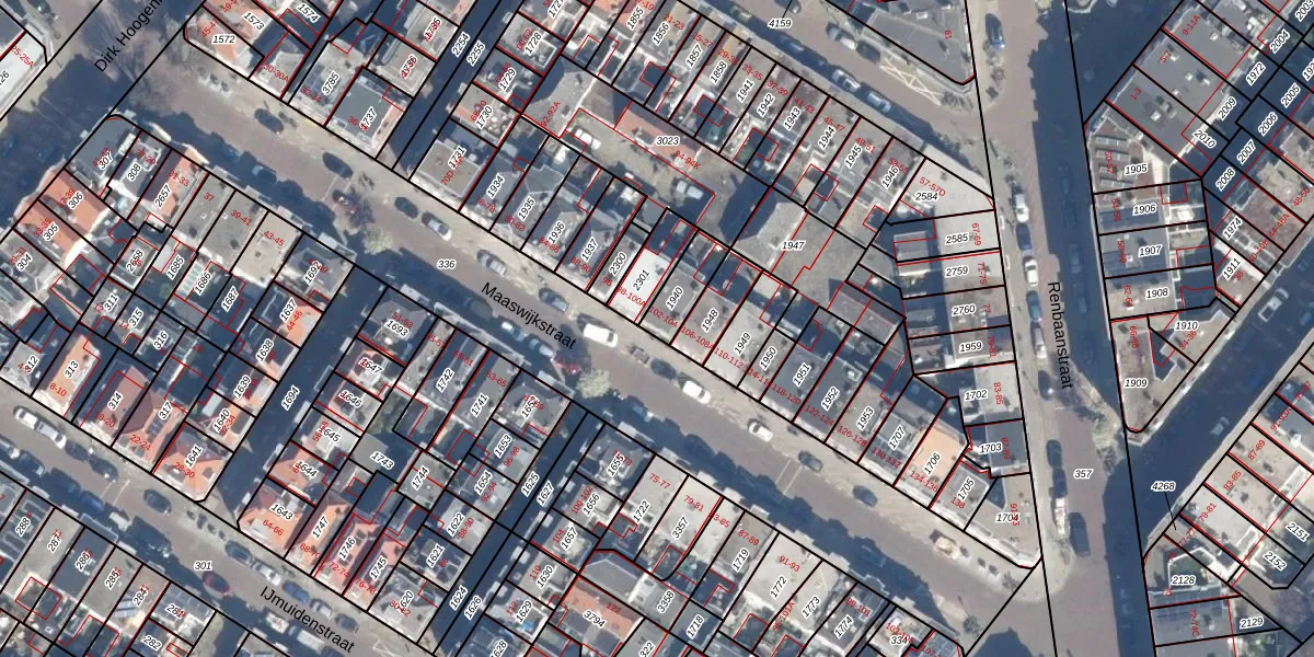 Het perceel waarop Maaswijkstraat 104 staat heeft een oppervlakte van 97 m². Dit is een klein perceel. De perceeloppervlakte wordt geregistreerd door het Kadaster. Gedetailleerde informatie over de maten van dit perceel kunt u vinden in het rapport Kadastrale kaart met maatvoering van Maaswijkstraat 104.
