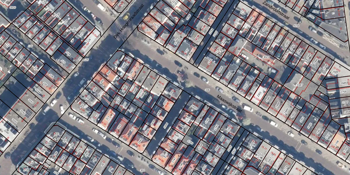 Het perceel waarop Maaswijkstraat 47 staat heeft een oppervlakte van 83 m². Dit is een klein perceel. De perceeloppervlakte wordt geregistreerd door het Kadaster. Gedetailleerde informatie over de maten van dit perceel kunt u vinden in het rapport Kadastrale kaart met maatvoering van Maaswijkstraat 47.