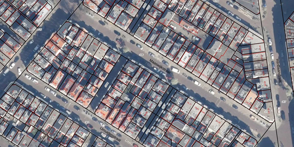 Het perceel waarop Maaswijkstraat 59 staat heeft een oppervlakte van 108 m². Dit is een middelgroot perceel. De perceeloppervlakte wordt geregistreerd door het Kadaster. Gedetailleerde informatie over de maten van dit perceel kunt u vinden in het rapport Kadastrale kaart met maatvoering van Maaswijkstraat 59.