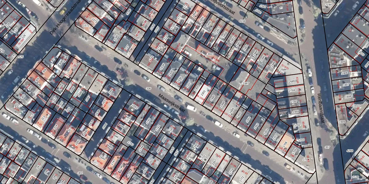 Het perceel waarop Maaswijkstraat 90 staat heeft een oppervlakte van 99 m². Dit is een klein perceel. De perceeloppervlakte wordt geregistreerd door het Kadaster. Gedetailleerde informatie over de maten van dit perceel kunt u vinden in het rapport Kadastrale kaart met maatvoering van Maaswijkstraat 90.