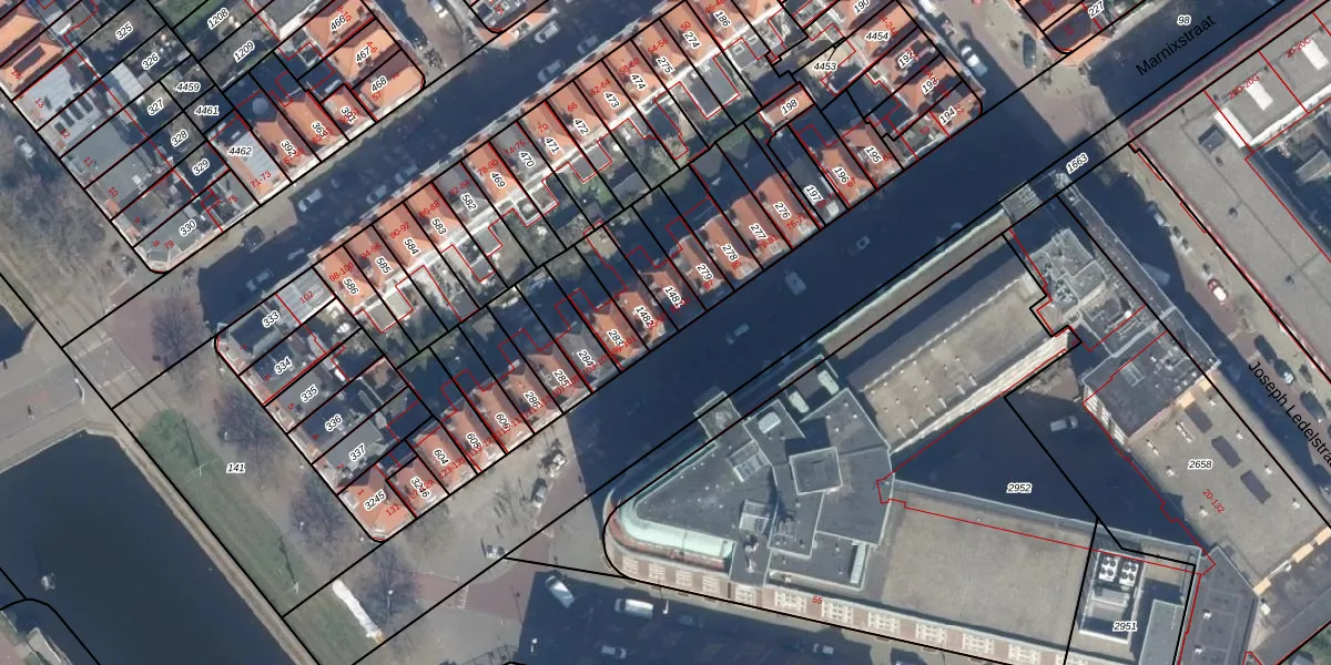 Het perceel waarop Marnixstraat 95 staat heeft een oppervlakte van 107 m². Dit is een middelgroot perceel. De perceeloppervlakte wordt geregistreerd door het Kadaster. Gedetailleerde informatie over de maten van dit perceel kunt u vinden in het rapport Kadastrale kaart met maatvoering van Marnixstraat 95.