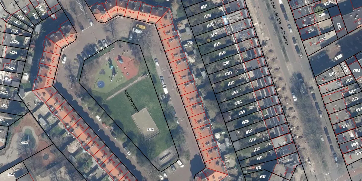 Het perceel waarop Moerbeiplein 23 staat heeft een oppervlakte van 2871 m². Dit is een zeer groot perceel. De perceeloppervlakte wordt geregistreerd door het Kadaster. Gedetailleerde informatie over de maten van dit perceel kunt u vinden in het rapport Kadastrale kaart met maatvoering van Moerbeiplein 23.