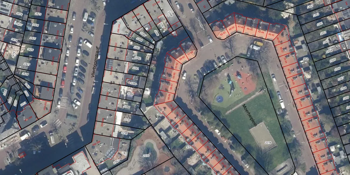 Het perceel waarop Moerbeiplein 66 staat heeft een oppervlakte van 3460 m². Dit is een zeer groot perceel. De perceeloppervlakte wordt geregistreerd door het Kadaster. Gedetailleerde informatie over de maten van dit perceel kunt u vinden in het rapport Kadastrale kaart met maatvoering van Moerbeiplein 66.