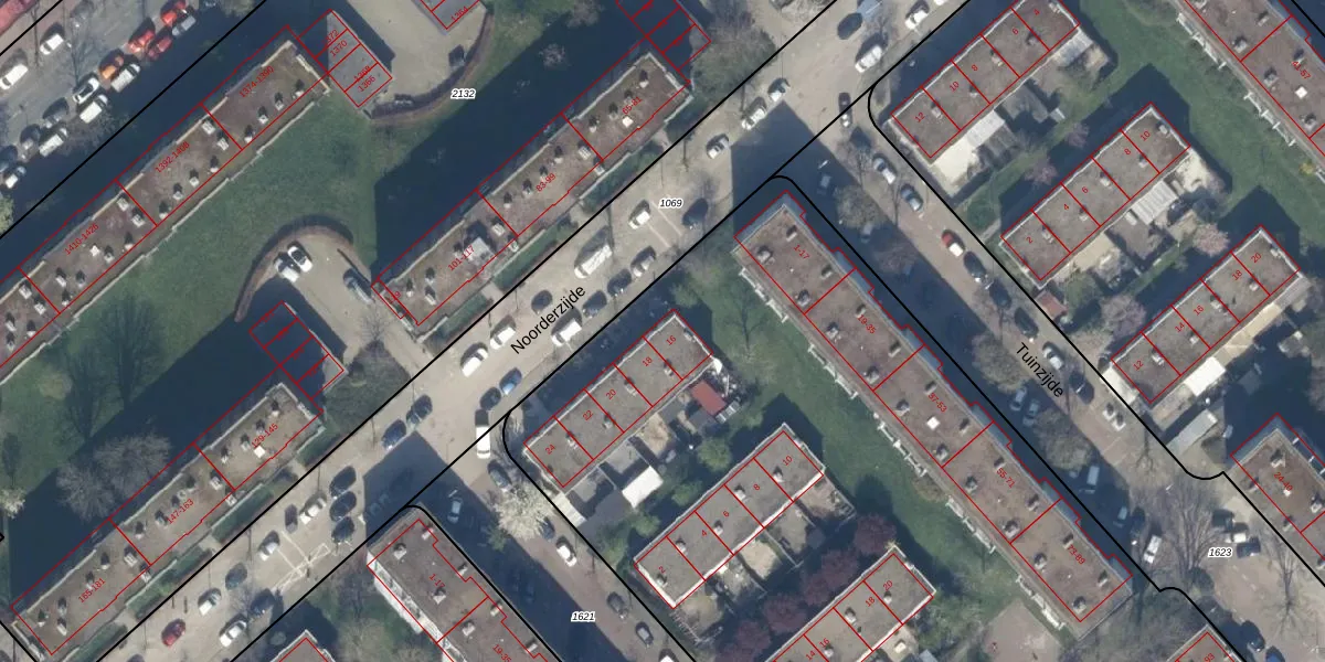 Het perceel waarop Noorderzijde 16 staat heeft een oppervlakte van 6583 m². Dit is een zeer groot perceel. De perceeloppervlakte wordt geregistreerd door het Kadaster. Gedetailleerde informatie over de maten van dit perceel kunt u vinden in het rapport Kadastrale kaart met maatvoering van Noorderzijde 16.