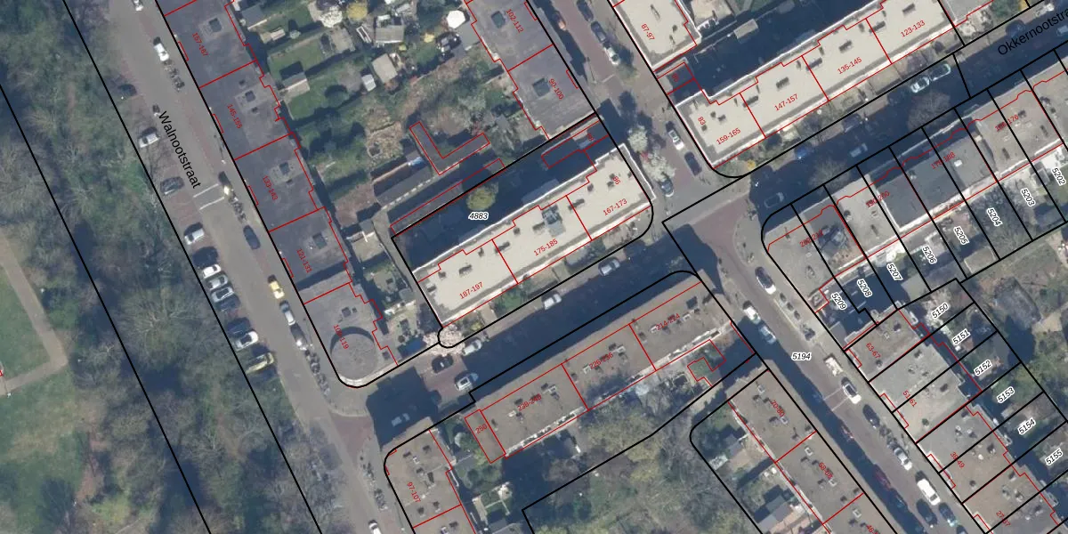 Okkernootstraat 185 is gelegen op kadastraal perceel LDN03I4883. Deze kadastrale aanduiding is uniek en wordt gebruikt door het Kadaster om eigendomsrechten en andere zakelijke rechten vast te leggen. Het perceel maakt onderdeel uit van de kadastrale gemeente Loosduinen.