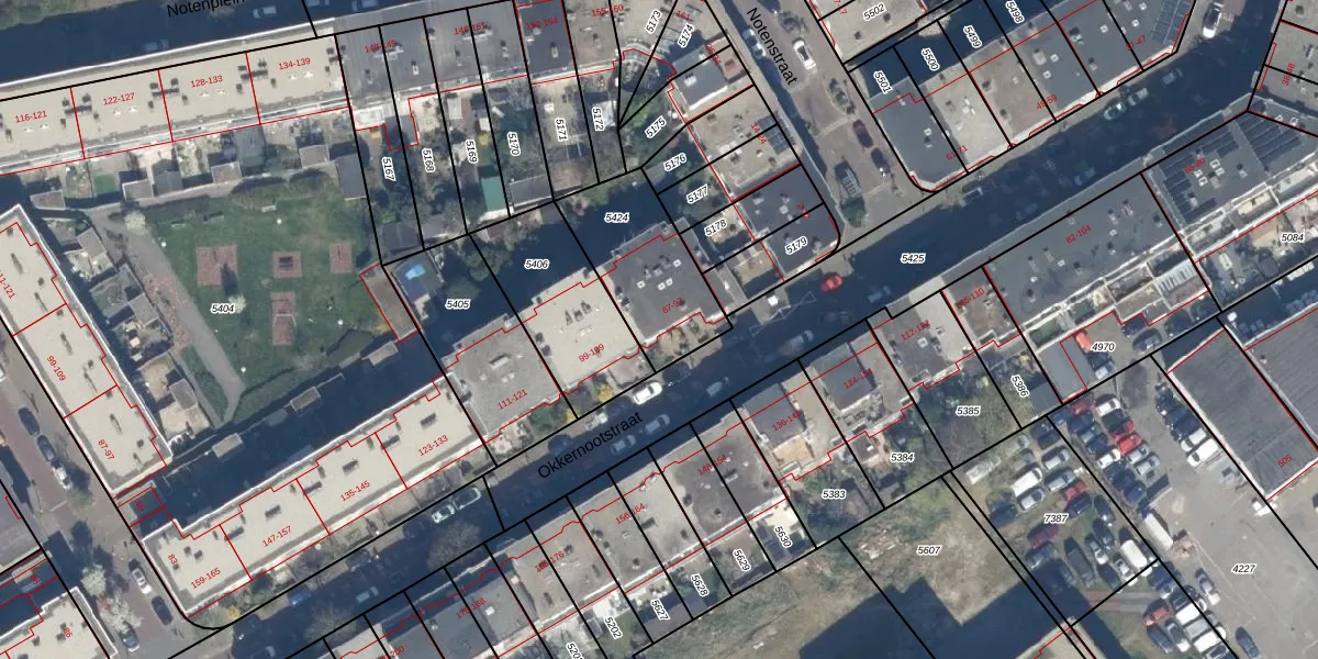 Okkernootstraat 97 is gelegen op kadastraal perceel LDN03I5424. Deze kadastrale aanduiding is uniek en wordt gebruikt door het Kadaster om eigendomsrechten en andere zakelijke rechten vast te leggen. Het perceel maakt onderdeel uit van de kadastrale gemeente Loosduinen.
