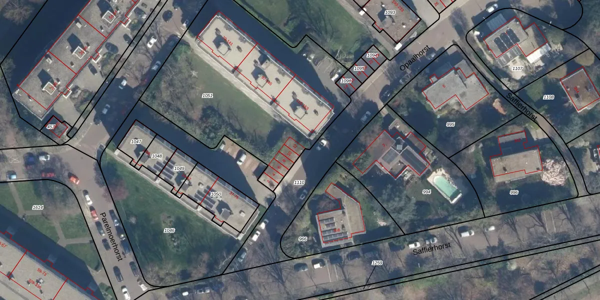 Het perceel waarop Opaalhorst 12 staat heeft een oppervlakte van 2440 m². Dit is een zeer groot perceel. De perceeloppervlakte wordt geregistreerd door het Kadaster. Gedetailleerde informatie over de maten van dit perceel kunt u vinden in het rapport Kadastrale kaart met maatvoering van Opaalhorst 12.