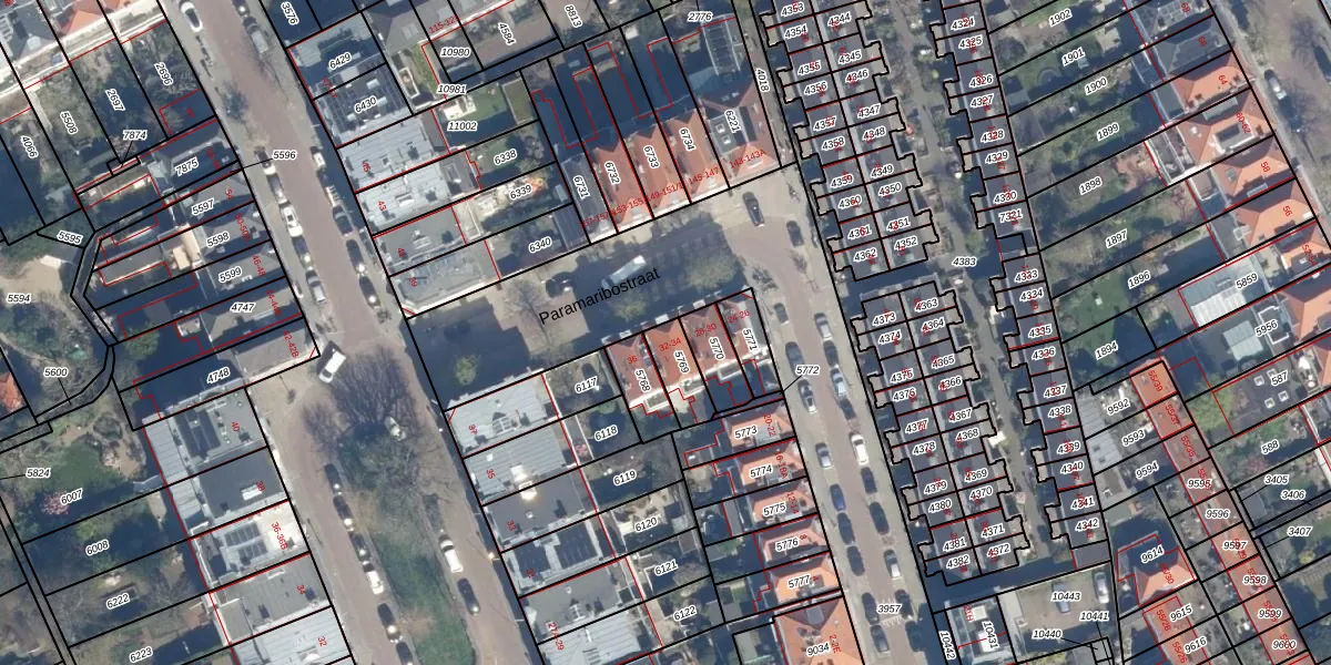 Het perceel waarop Paramaribostraat 32 staat heeft een oppervlakte van 94 m². Dit is een klein perceel. De perceeloppervlakte wordt geregistreerd door het Kadaster. Gedetailleerde informatie over de maten van dit perceel kunt u vinden in het rapport Kadastrale kaart met maatvoering van Paramaribostraat 32.