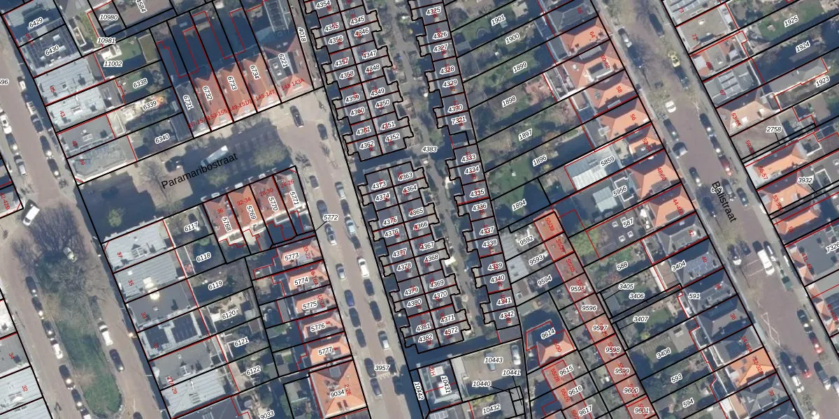 Het perceel waarop Paramaribostraat 87 staat heeft een oppervlakte van 30 m². Dit is een klein perceel. De perceeloppervlakte wordt geregistreerd door het Kadaster. Gedetailleerde informatie over de maten van dit perceel kunt u vinden in het rapport Kadastrale kaart met maatvoering van Paramaribostraat 87.