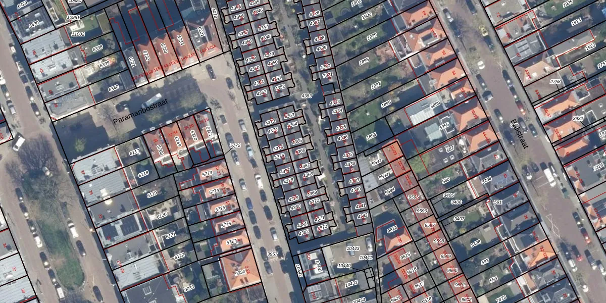 Het perceel waarop Paramaribostraat 89 staat heeft een oppervlakte van 30 m². Dit is een klein perceel. De perceeloppervlakte wordt geregistreerd door het Kadaster. Gedetailleerde informatie over de maten van dit perceel kunt u vinden in het rapport Kadastrale kaart met maatvoering van Paramaribostraat 89.