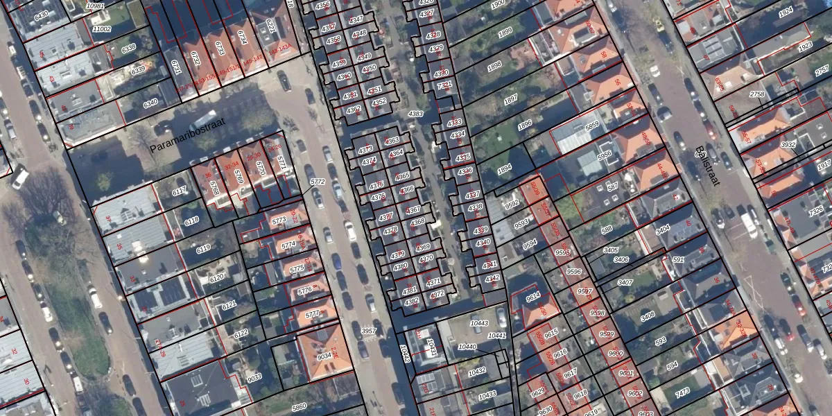 Het perceel waarop Paramaribostraat 91 staat heeft een oppervlakte van 30 m². Dit is een klein perceel. De perceeloppervlakte wordt geregistreerd door het Kadaster. Gedetailleerde informatie over de maten van dit perceel kunt u vinden in het rapport Kadastrale kaart met maatvoering van Paramaribostraat 91.