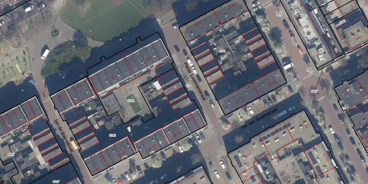 Het perceel waarop Pieter Lastmanstraat 9 staat heeft een oppervlakte van 2379 m². Dit is een zeer groot perceel. De perceeloppervlakte wordt geregistreerd door het Kadaster. Gedetailleerde informatie over de maten van dit perceel kunt u vinden in het rapport Kadastrale kaart met maatvoering van Pieter Lastmanstraat 9.