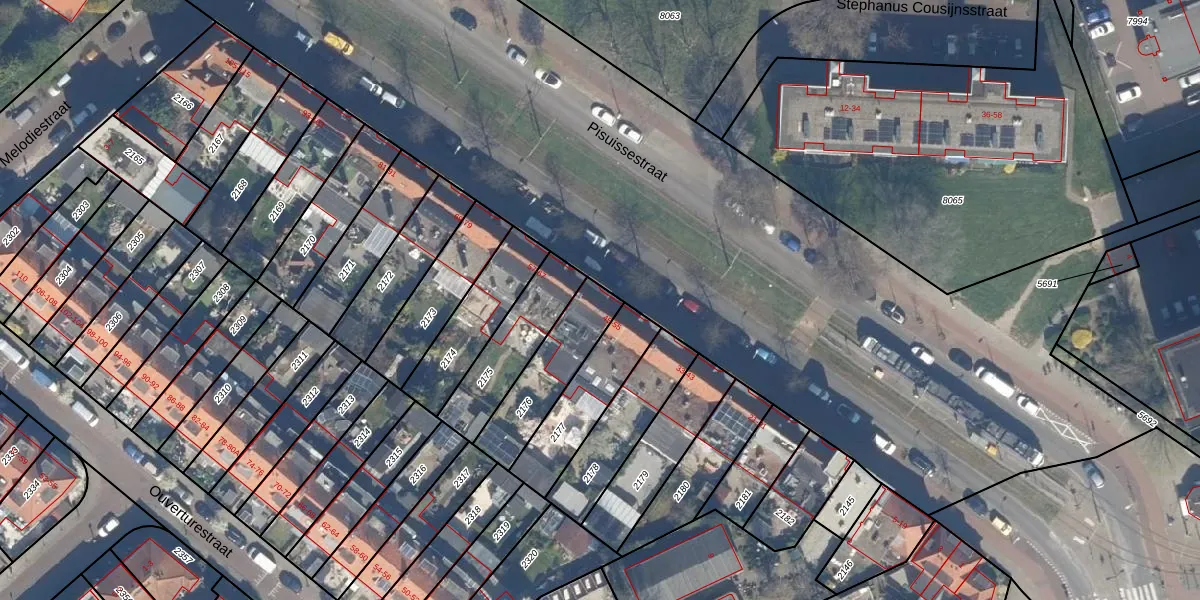 Pisuissestraat 55 is gelegen op kadastraal perceel LDN03G2176. Deze kadastrale aanduiding is uniek en wordt gebruikt door het Kadaster om eigendomsrechten en andere zakelijke rechten vast te leggen. Het perceel maakt onderdeel uit van de kadastrale gemeente Loosduinen.